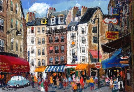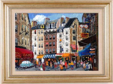 パリの喧噪が聞こえてきそうな賑やかな油絵の絵画です。