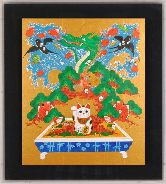 あごぱんがアクリル画の絵画で描いた現代アートの絵「福の盆栽・昇龍の松」はご購入済みとなりました。