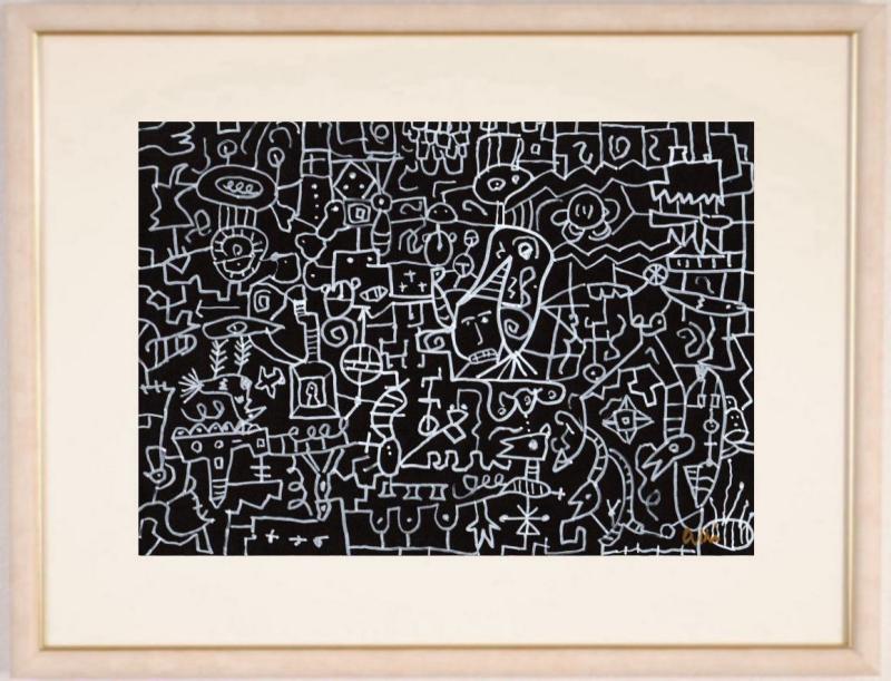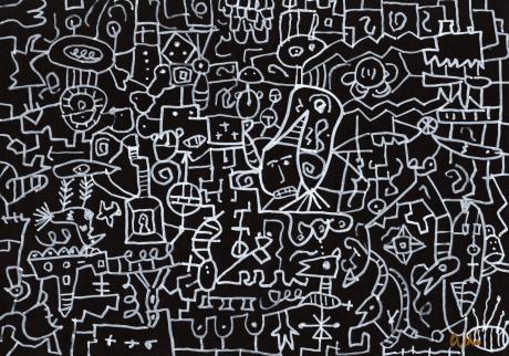 黒い背景に、白いペンで描かれた抽象画の絵画のようなポップアートの絵は、とてもユニークです。