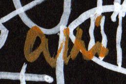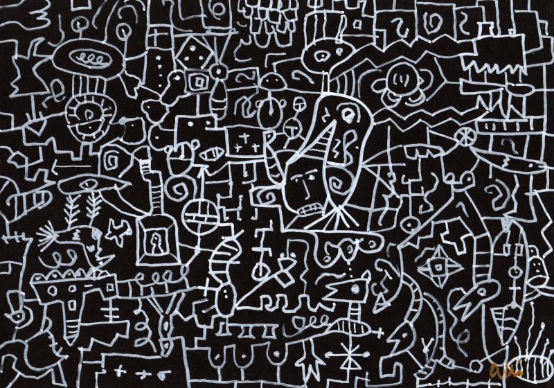 このミクストメディアの絵画は、水彩絵の具や油性ペンを使って描かれています。