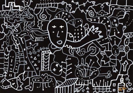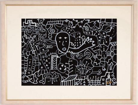 黒い背景に白い油性ペンで描かれた抽象画の絵画のようなポップアートは、キース・へリングの絵のような面白さもあります。