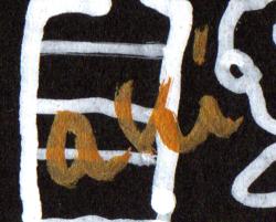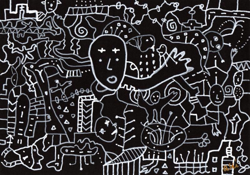 このミクストメディアの絵画は、水彩絵の具や油性ペンを使って描かれています。