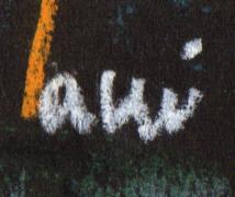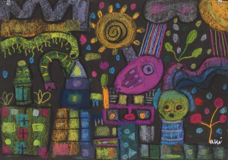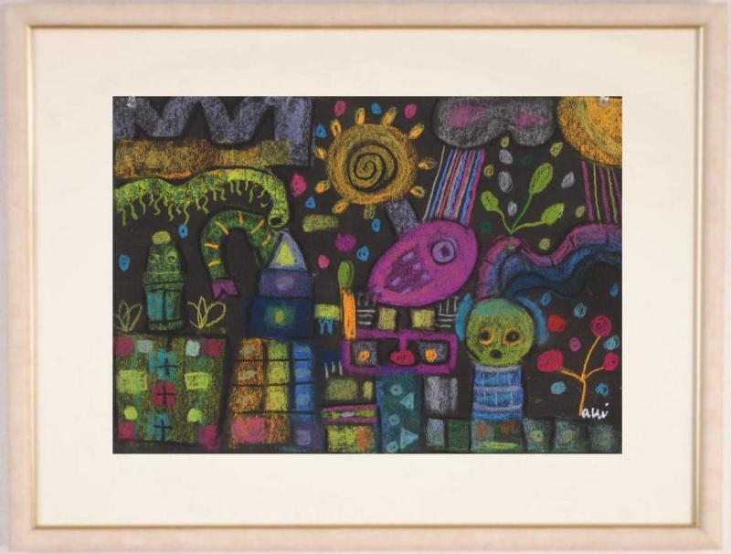 このミクストメディアの絵画は、クレヨンや水彩絵の具などで描かれています。
