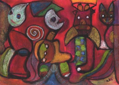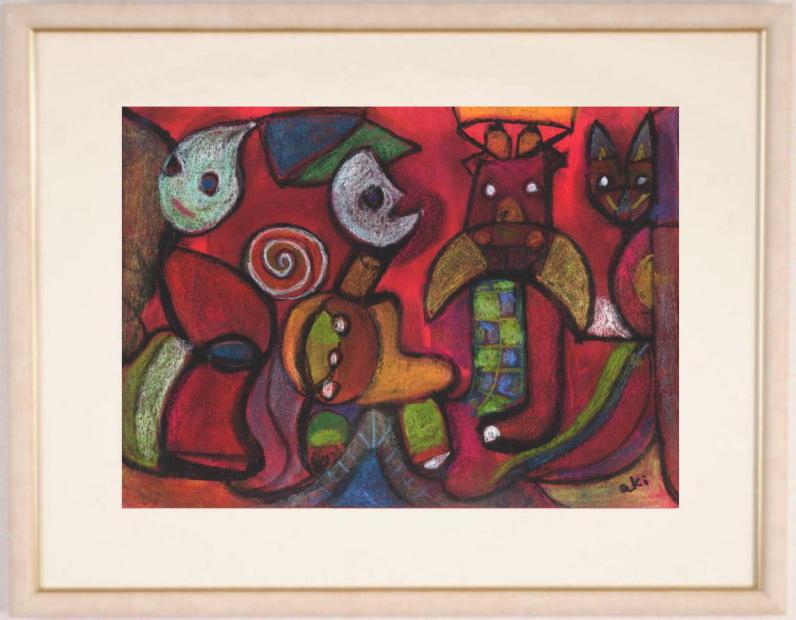 秋永清二さんがミクストメディアの絵画で描いた抽象画の絵「仮面の祭り」をぜひご自宅のインテリアやプレゼントの絵としてご購入ください。
