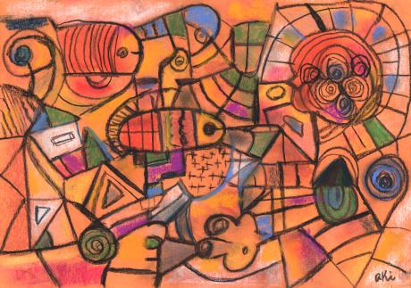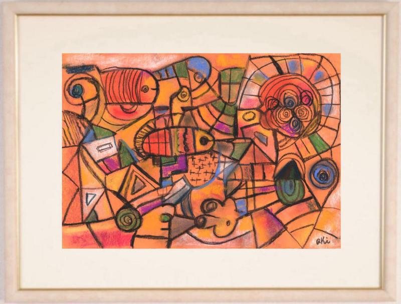魚や家など具象的に描かれた部分もある抽象画の絵画です。