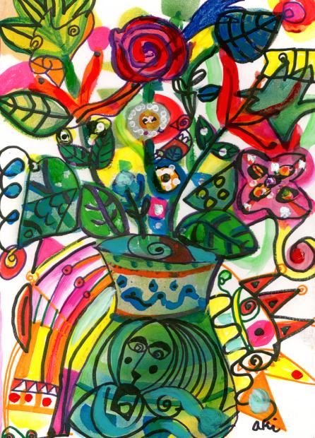 秋永清二さんがミクストメディアの絵画で描いた花の絵「賑やかな花束」は、2023年に描かれた絵です。