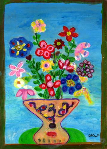秋永清二さんがミクストメディアの絵画で描いた花の絵「ブルーの背景の花束」は、2023年に描かれた花の絵です。