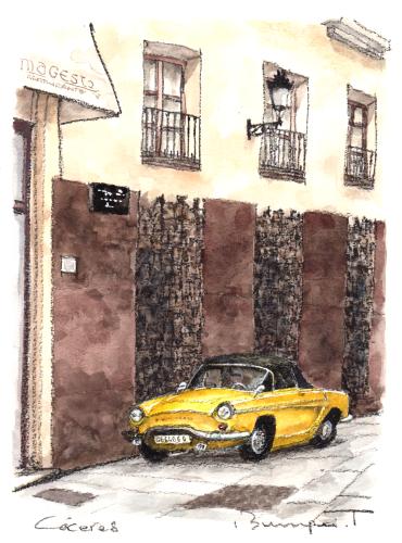 高橋文平さんの水彩画の絵画「カセレス」の主役は、世界遺産の町の風景ではなく、黄色いクラッシックカーでした。