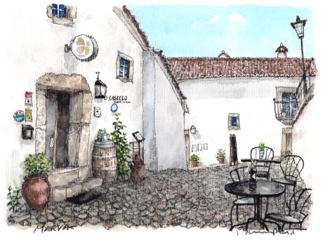 この水彩画の絵画で描かれているマルヴァオン(Marvao)とは、スペインとの国境近く、標高865メートルの断崖の上に築かれた中世の城郭都市です。