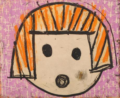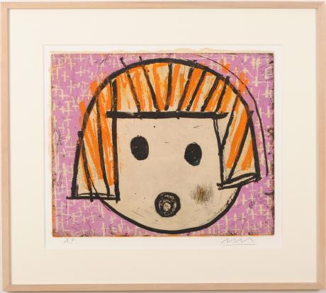 この現代アートの絵画「女子・紫」も、可愛いいような懐かしいような何とも不思議で、でも無視できない存在感がある銅版画だと思います。