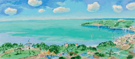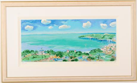 平野琳人さんがシルクスクリーンの版画で制作した海の絵画「草競馬の日」は、エメラルドグリーンの海と風景がとても美しいシルクスクリーンの版画です。