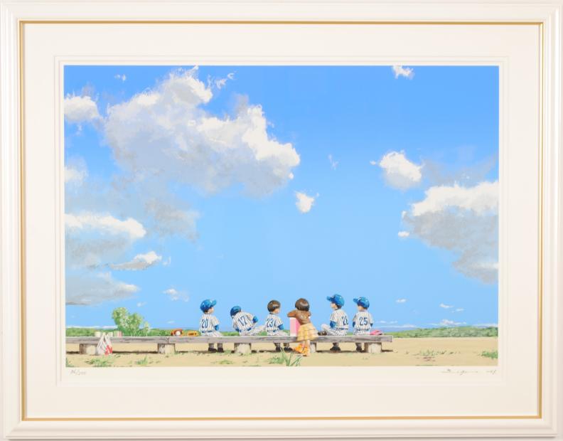 櫻井幸雄さんがシルクスクリーンの版画で制作したインテリアの絵画「ゆるやかな会話」は、青空の下で野球の試合を見学している子供たちが描かれたインテリアの絵です。