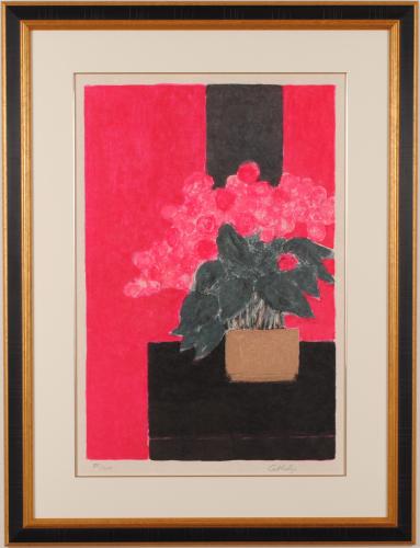 ベルナール・カトランがリトグラフの版画で制作した花の絵画「赤と黒の背景の百日草」をぜひご自宅のインテリアやコレクションの絵としてご購入ください。