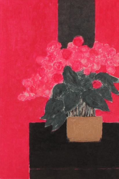 ベルナール・カトランがリトグラフの版画で制作した花の絵画「赤と黒の背景の百日草」は、1998年〜2004年の間に制作されたリトグラフの版画です。