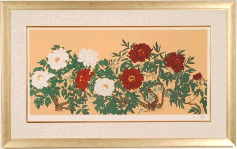 このジークレーの版画は、長野県小布施町にある「おぶせミュージアム・中島千波館」に所蔵されている中島千波さんの同名の日本画の絵画「富貴華宴」を原画として制作された和の花の絵です。
