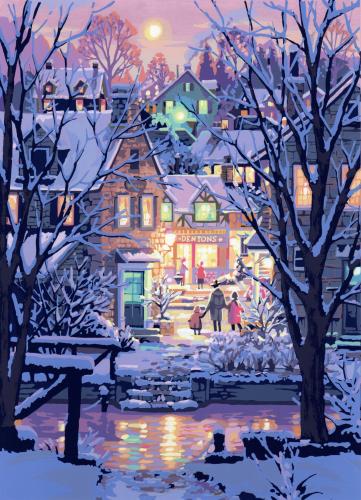 雪が積もった寒い冬の季節でも、明るい光が人々の幸せな暮らしを垣間見せてくれているようです。