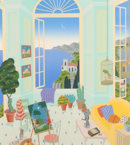 このインテリアの絵画「グリーン・スタジオ」は、窓から見える海の眺めがとても美しく、描きかけのキャンバスとまだ油絵具がのったままのパレットが置いてあります。