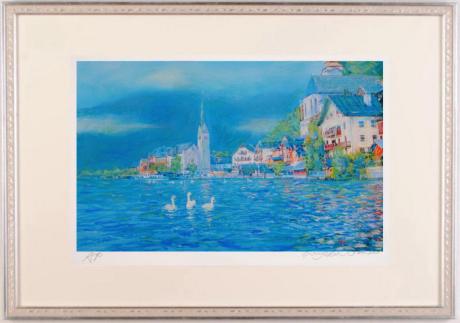 このインテリアの絵画は「世界の湖畔で最も美しい町」と呼ばれるオーストリアのハルシュタットの風景を描いたジークレーの版画です。