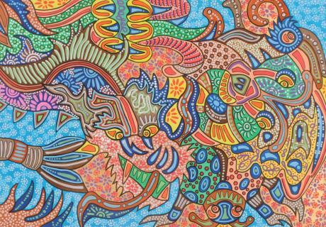 横山泰三さんの現代アートは、アクリル絵の具や水彩、ペンなどで描かれたミクストメディアの絵画です。