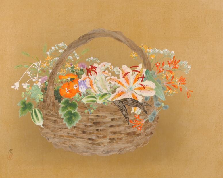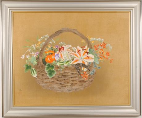 F30号というサイズの大きな日本画の絵画で、竹の花籠に活けられた野の花々がとても瑞々しい美しさに溢れています。