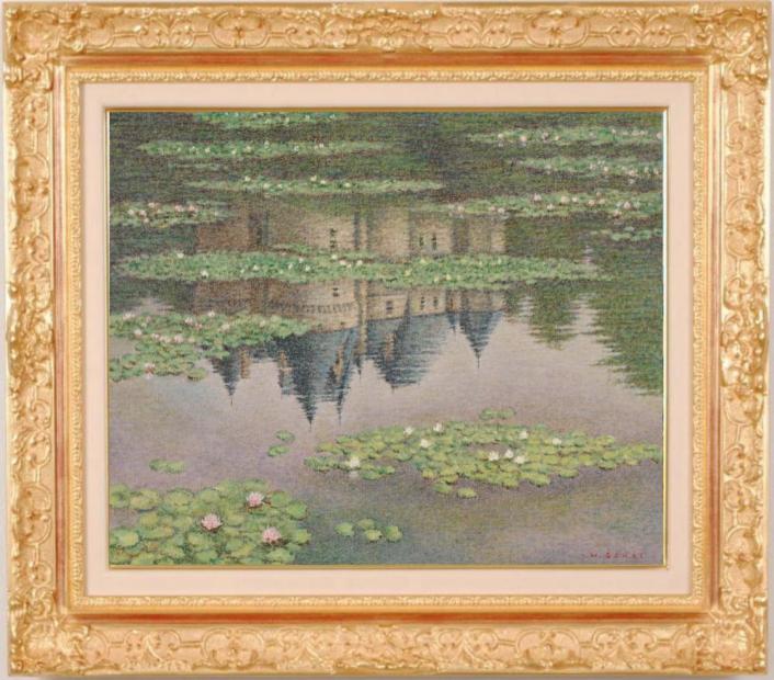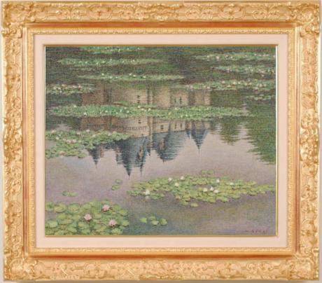 酒井英利さんが油絵の絵画で描いた睡蓮の花の絵「水辺」は、1995年に描かれたフランスの風景画です。