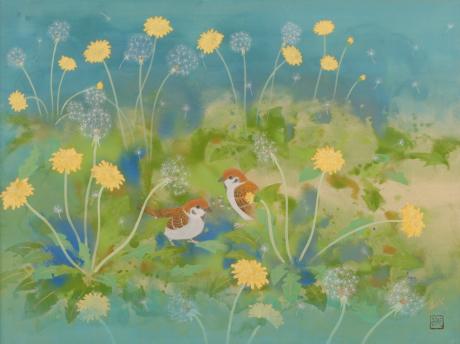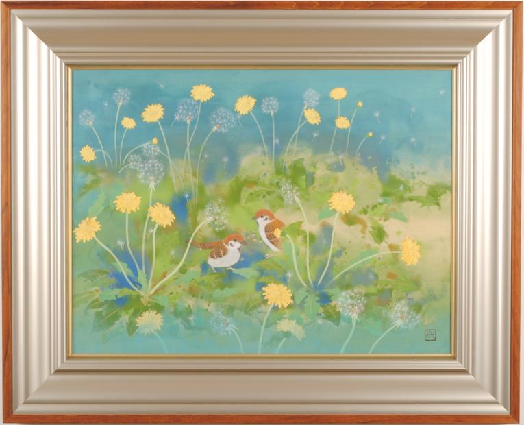 秦誠(はたまこと)さんが日本画の絵画で描いた和のインテリアの絵「野の春」は、タンポポの咲く野原で戯れる二羽の雀を描いた日本画の絵画です。