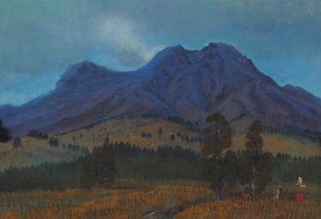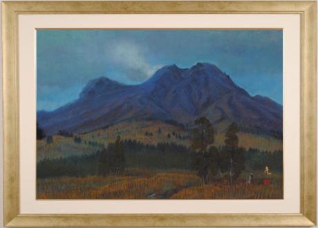 この日本画の絵画「阿蘇中岳」も、独特な群青で彩られた幻想的な美しさに心が持って行かれる魅力的な風景画です。