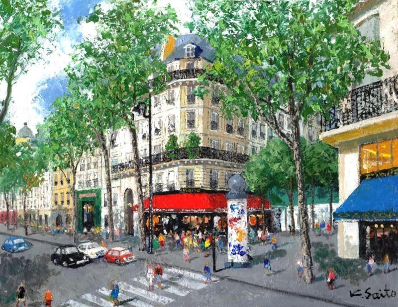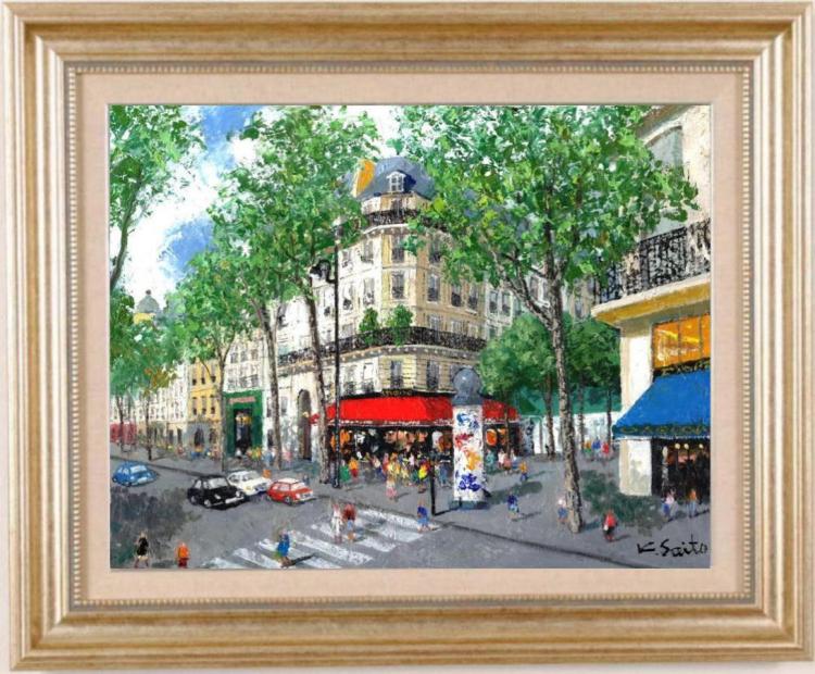 斉藤要さんが油絵の絵画で描いたパリの風景画「カフェのある通り・4」をぜひご自宅のインテリアやプレゼントの絵としてご購入ください。