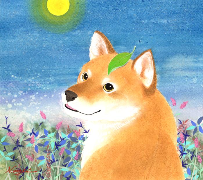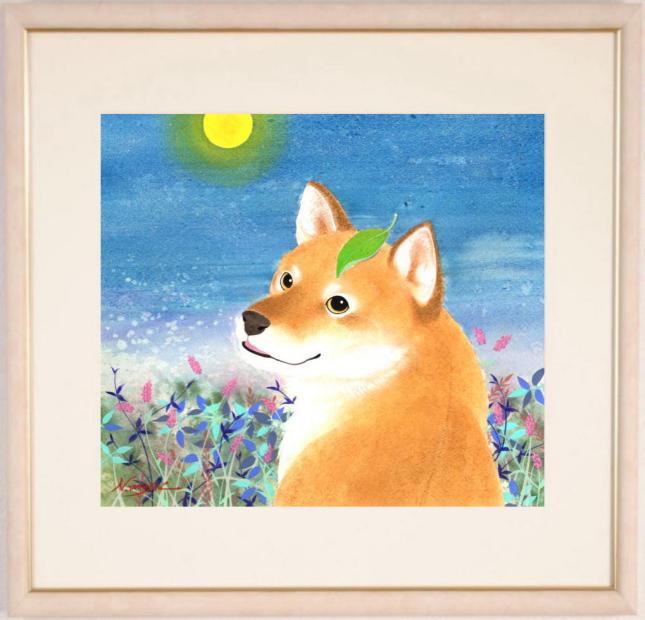頭に葉っぱを載せている犬の表情が、とても可愛いミクストメディアの絵画です。