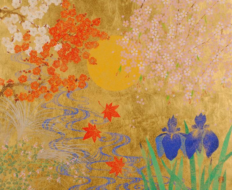 渡辺章雄(わたなべあきお)さんが日本画の絵画で描いた和の花の絵「四季草花図」は、背景の金箔がとても豪華な和の花の絵です。