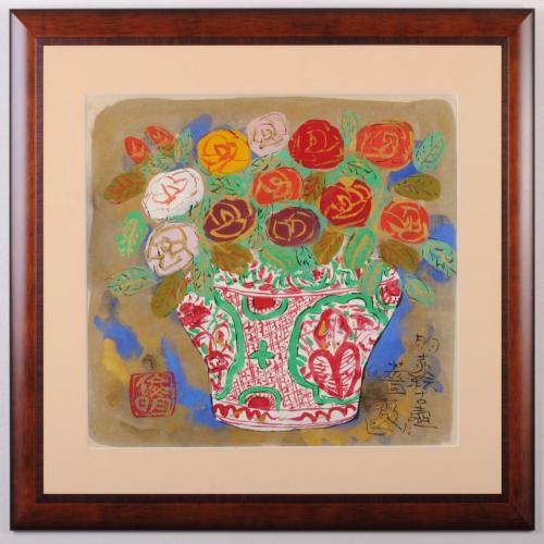 渡辺俊明さんが墨彩画の絵画で描いた和の花の絵「明赤絵古壺に薔薇図」は、1995年に描かれた墨彩画です。