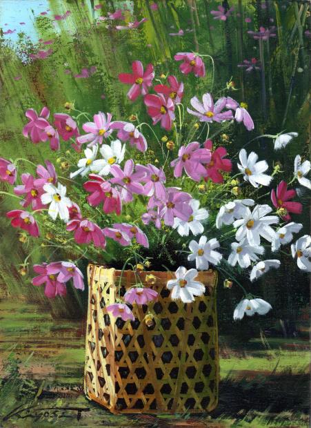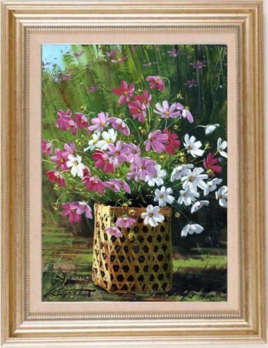 田中清さんが油絵の絵画で描いたコスモスの花の絵画「朝の庭で」をぜひご自宅のインテリアやプレゼントの絵としてご購入ください。