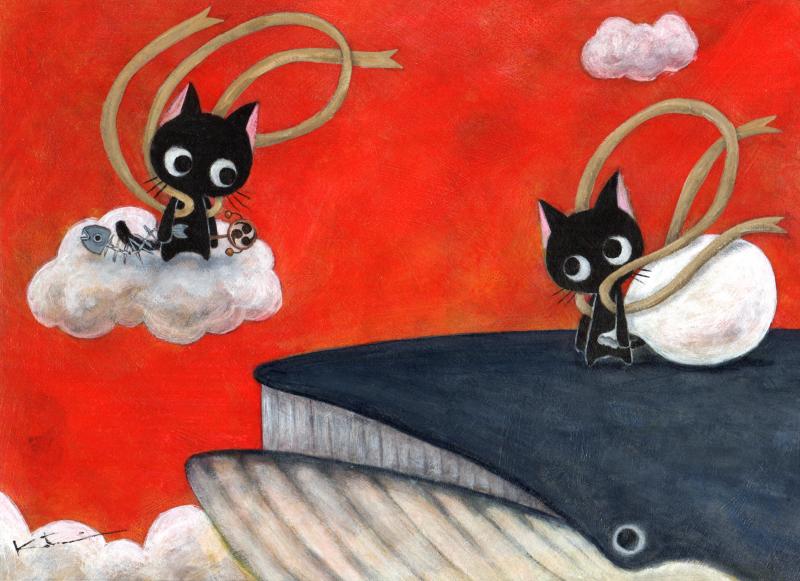 風にゃんが乗っている雲の上にはでんでん太鼓と猫の骨、大きな鯨に乗った雷にゃんは大きな袋を持っています。