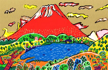志摩欣哉さんがシルクスクリーンの版画で制作した赤富士の和の絵「朱不二早春譜」をぜひご自宅のインテリアやプレゼントとしてご購入ください。
