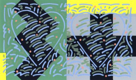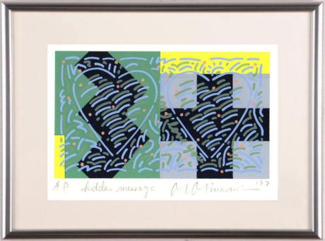 南正雄先生がシルクスクリーンの版画で制作した現代アートの絵画「隠されたメッセージ」は、1997年に制作されたシルクスクリーンの版画です。