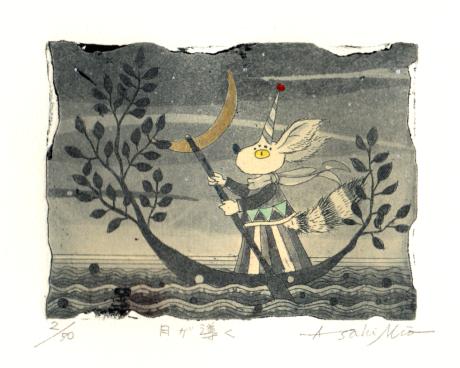 朝日みおさんがエッチングとアクアチントの技法を併用し、ステンシルと呼ばれる紙版や手彩で色を付けた銅版画「月が導く」は、何だか不思議な生き物が主役のインテリアの絵です。
