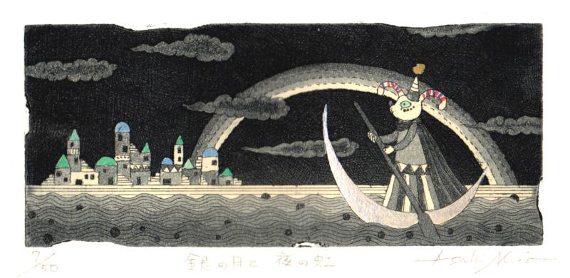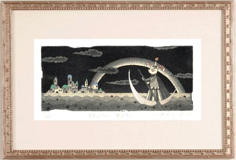 朝日みおさんが銅版画で制作したインテリアの絵画「銀の月と夜の虹」を、ぜひご自宅のインテリアやプレゼントの絵としてご購入ください。