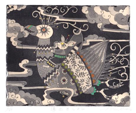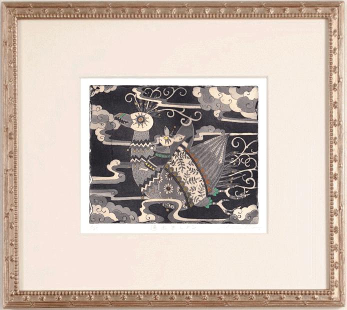 朝日みおさんがエッチングとアクアチントの技法を併用して制作した銅版画「遠出をしよう・2」は、大きな鳥に乗ったウサギ(ネズミ?)がとても可愛いインテリアの絵画です。