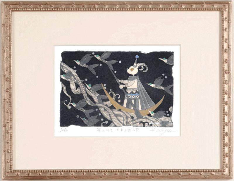 朝日みおさんが銅版画で制作したインテリアの絵画「星の川を流れる金の月」を、ぜひご自宅のインテリアやプレゼントの絵としてご購入ください。