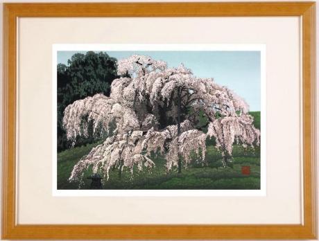 宮本秋風(みやもとしゅうふう)さんが木版画で制作した和の桜の絵画「三春の滝桜」は、福島県にある桜を描いたインテリアの絵画です。