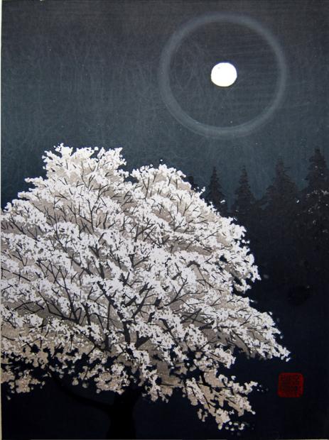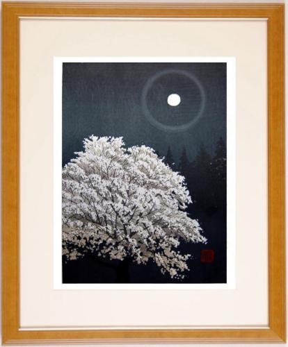宮本秋風(みやもとしゅうふう)さんが木版画で制作した和の桜の絵画「桜一木」は、月の光に照らされた一本の桜の木を描いたインテリアの絵です。