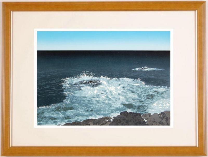 宮本秋風(みやもとしゅうふう)さんが木版画で制作した海の絵画「潮騒」は、伊豆大島の海の風景を描いたインテリアの絵画です。