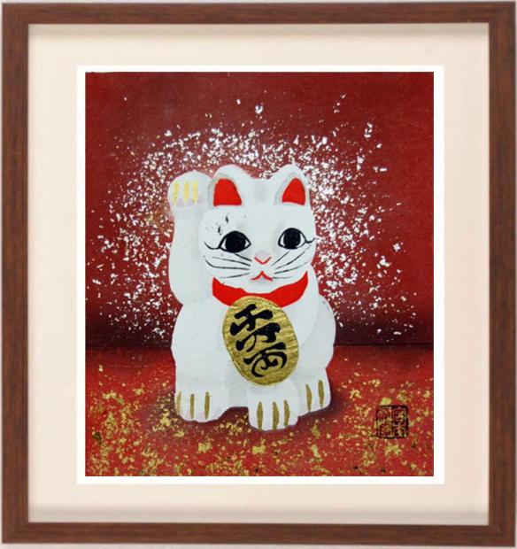 宮本秋風(みやもとしゅうふう)さんが木版画で制作した和のインテリアの絵画「招き猫」は、目出度さ一杯の招き猫の絵です。
