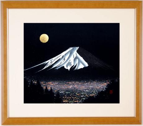 宮本秋風(みやもとしゅうふう)さんが木版画で制作した富士山の和の絵画「夜富士」は、月に照らされた夜の富士山を描いたインテリアの絵画です。