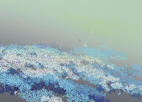 池上壮豊先生がシルクスクリーンの版画で制作した蝶の絵画「苑-21」は、花畑の上を5匹の蝶がひらひらと飛び回っている蝶の絵です。
