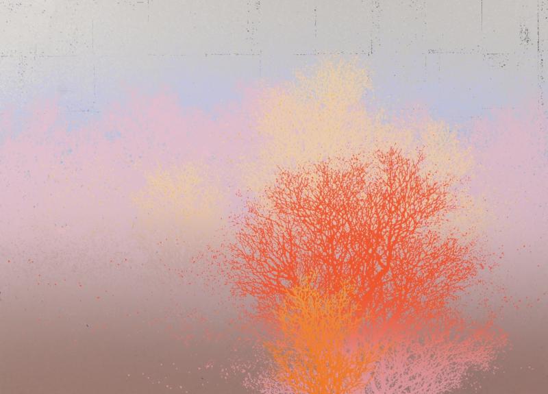 池上壮豊先生がシルクスクリーンの版画で制作した木の絵画「紅景」は、海の中のサンゴを見ているような美しい木の絵です。