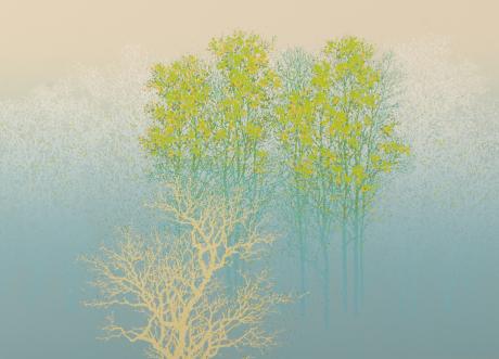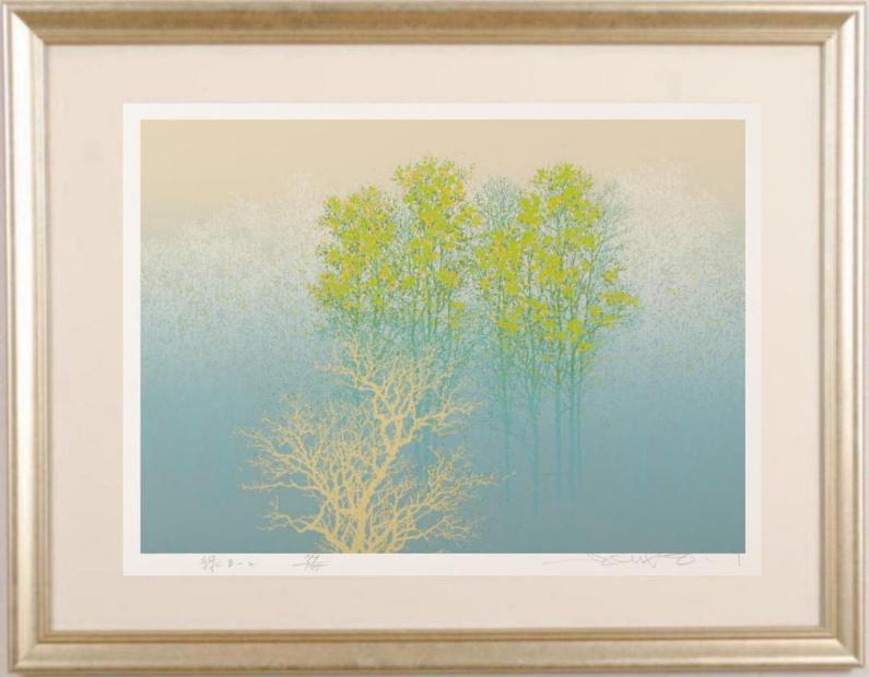 池上壮豊先生がシルクスクリーンの版画で制作した木の絵画「緑日-2」は、緑の色がとても美しい木の絵です。