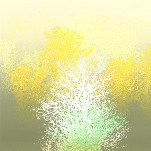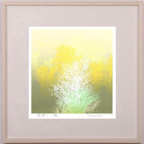 池上壮豊先生がシルクスクリーンの版画で制作した木の絵画「陽景-3」は、黄色くて明るいイメージの木の絵画です。