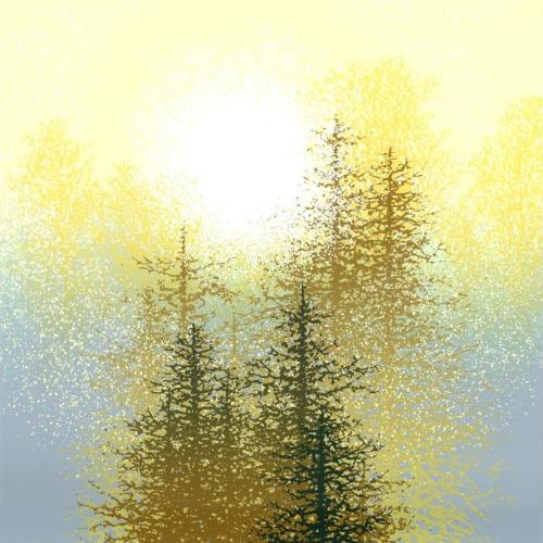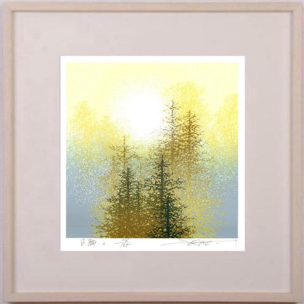 池上壮豊先生がシルクスクリーンの版画で制作した木の絵画「日輪-2」は、神々しさを感じる太陽と木の絵画です。