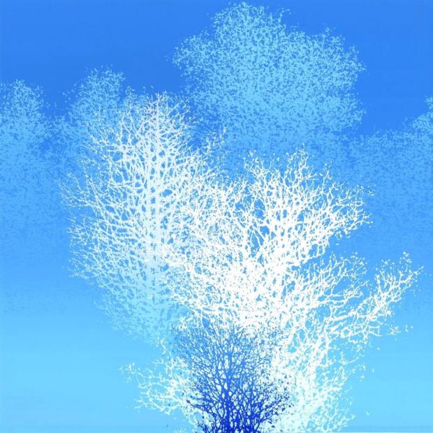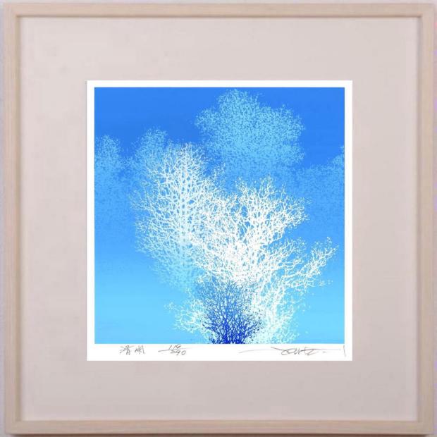 池上壮豊先生がシルクスクリーンの版画で制作した木の絵画「清閑」は、白と青の色で描かれた木の絵です。